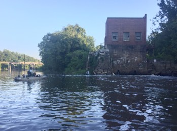 I fished through, up to the rapids. I got out, climbed a hill to survey the large and inaccessible dam, then left the area. I fished my way back without luck. A boat was parked in our original spot, so I fished downstream, with Drew not far behind, lazily drifting down the opposite shore. It was the halfway point, the sun was high and a hot wind was brewing. I was beginning to feel the heat.