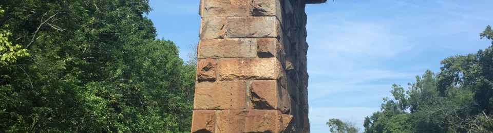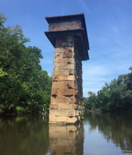 I found an abandoned railroad bridge pylon. It was in the shade, and I parked there to cool off. What happened to this bridge? Was it swept away? Exploded? Abandoned? Was there structure left nearby, underwater? Should I bother to check?