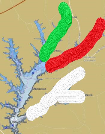 It can be divided in four sections. The first is the long arm that runs east to west (in red on the map below), on which the Hollemans boat ramp is located. This arm has a shallow, east end (above the bridge) and concludes on the main lake. Moving counter-clockwise, there is the White Oak branch (green on the map), which runs at an angle from the southeast to the north and east. This section has the reactor facility on its western shore, and has a grassy creek at the shallow, northern end.