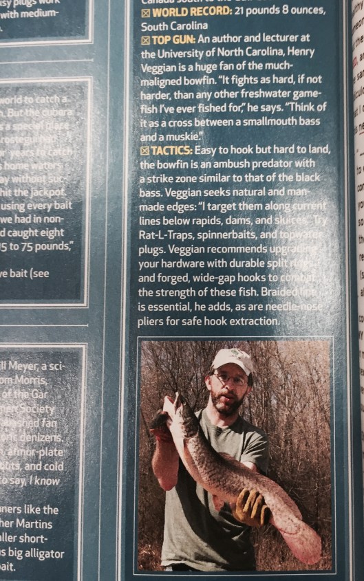 The latest issue of Outdoor Life magazine (April 2017) contains a short feature about Bowfin fishing. The article is largely based on an interview with yours truly. For some reason, the editors chose to place it on a page entitled “Ugly Fish.” Look at the Bowfin I am holding in the photo – it’s a beauty. Nonetheless, it’s always good to grab some positive press for this under-rated and misunderstood native species, and I am particularly honored to be included in a magazine that I have read since I was a child. Thank you, Outdoor Life!